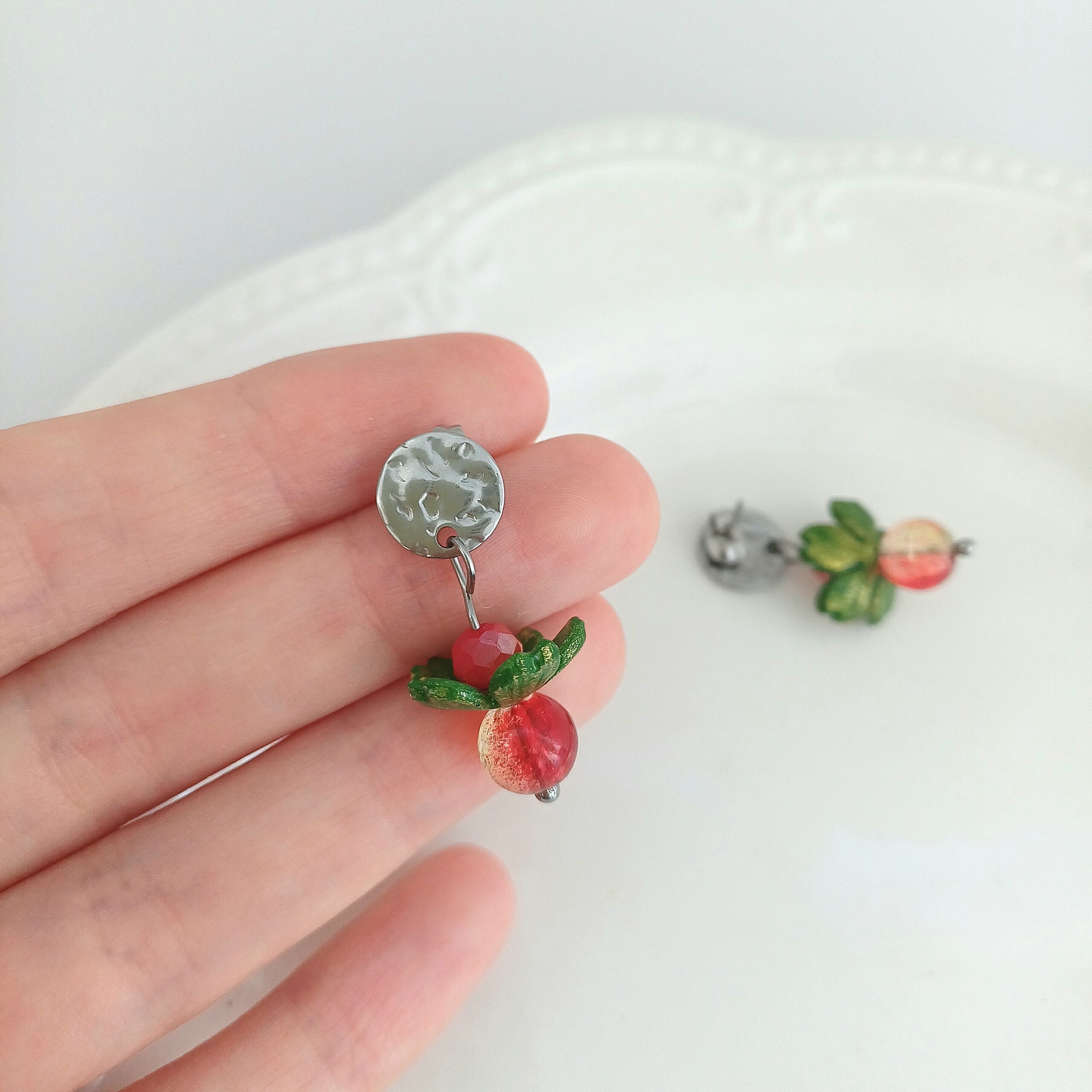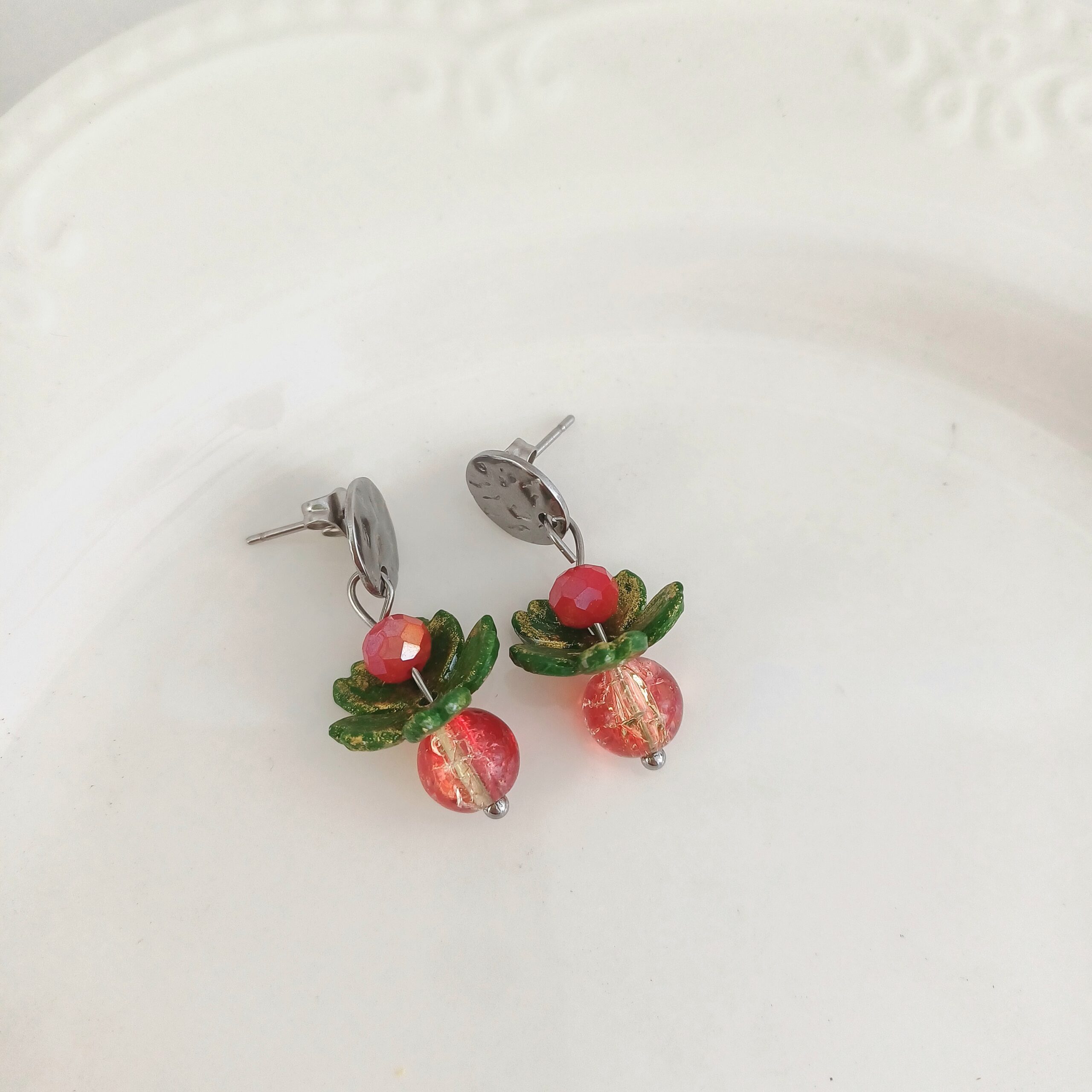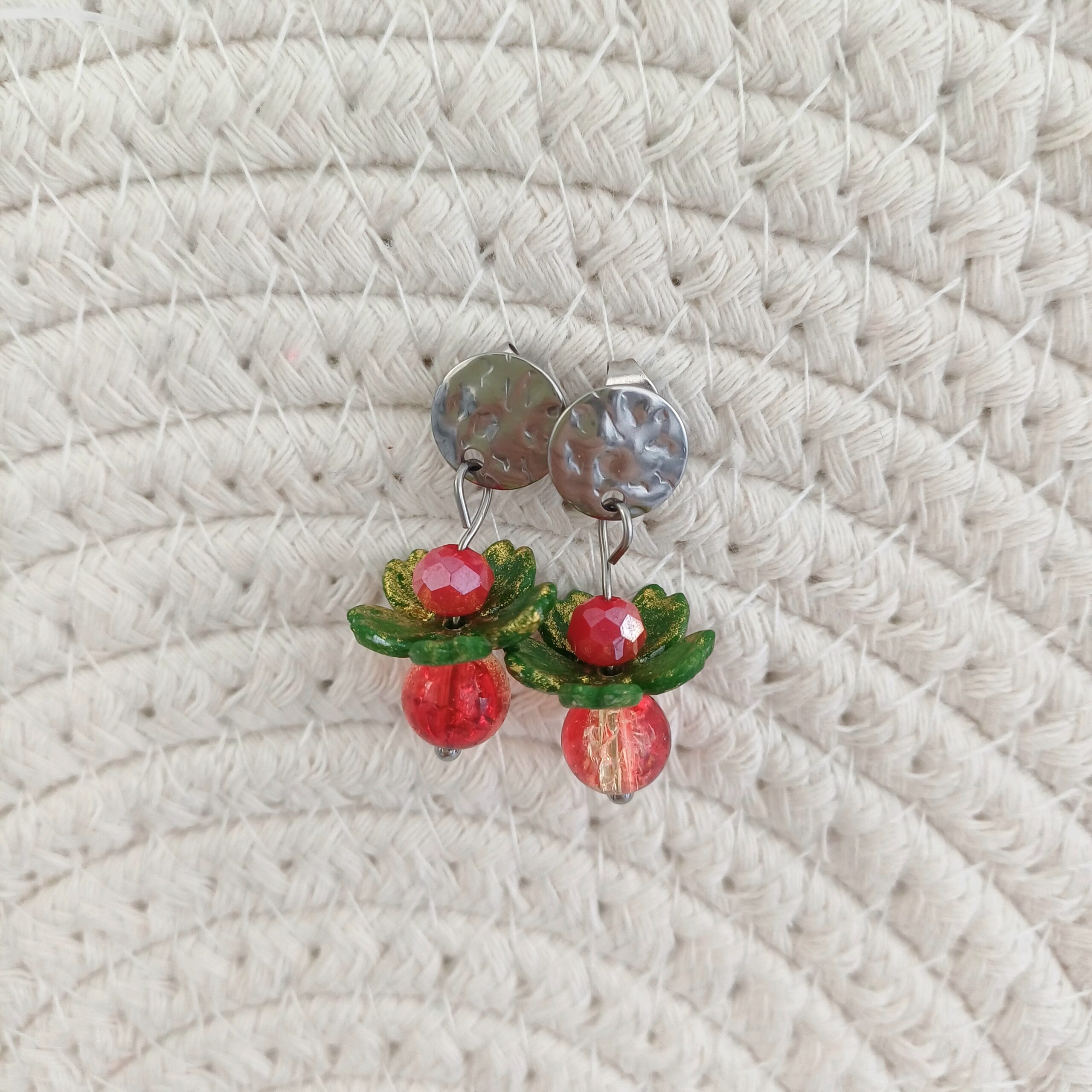 Cerceii sunt realizati din margele de sticla rosii, atent alese pentru a reda aspectul fragutelor, combinate cu frunze pictate manual in nuante de verde intens. Fiecare detaliu este lucrat cu grija, rezultand un design unic si expresiv.