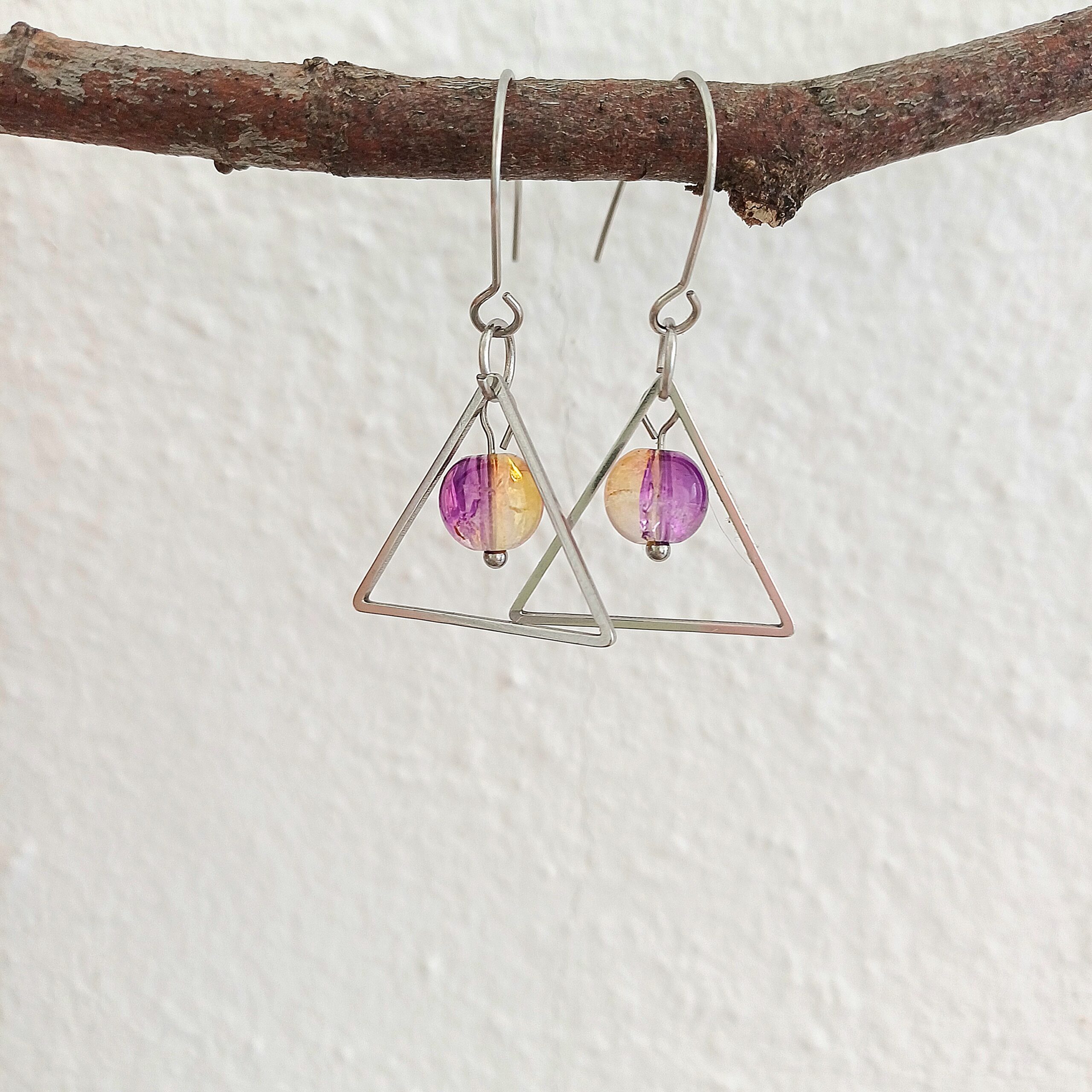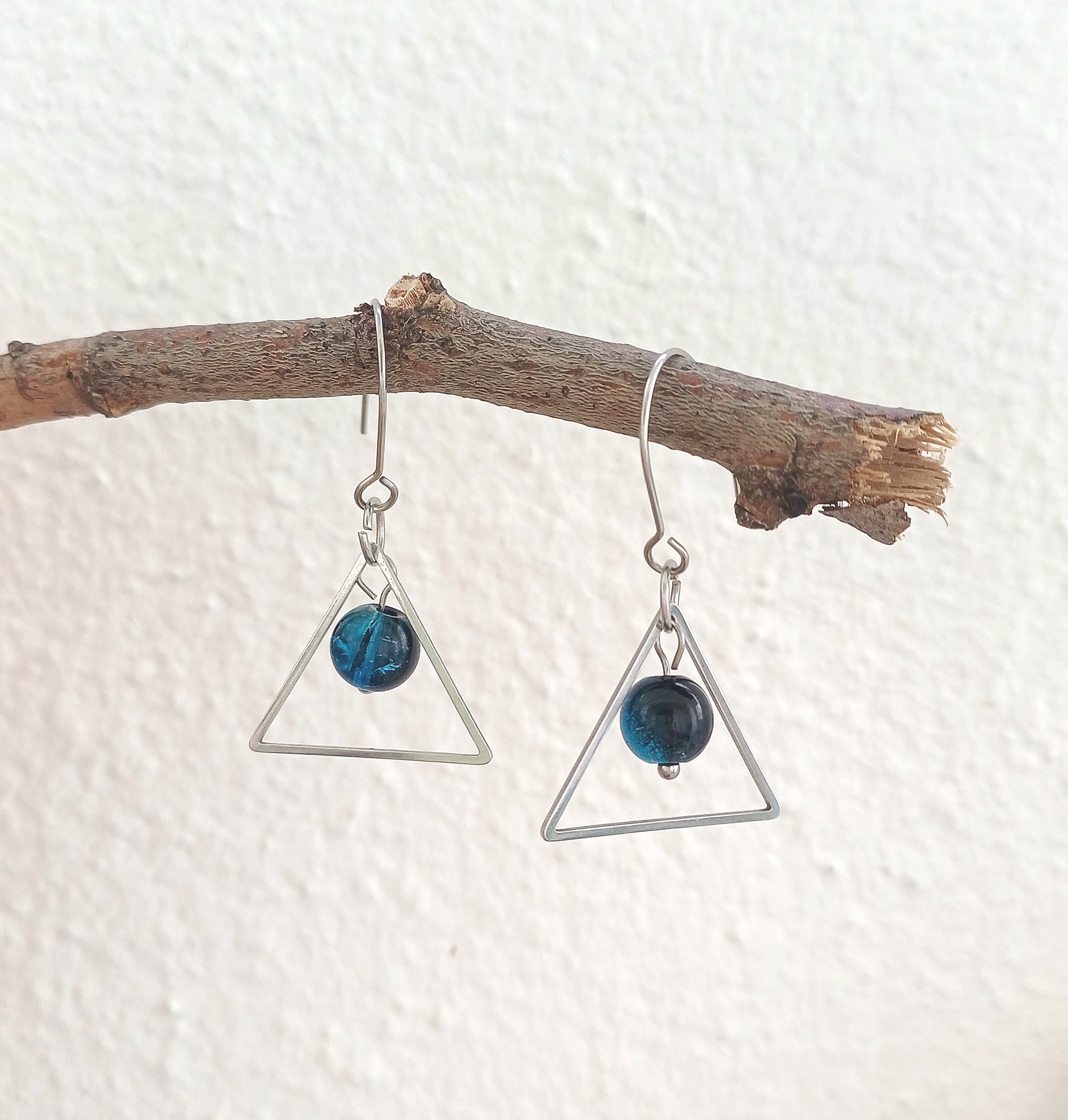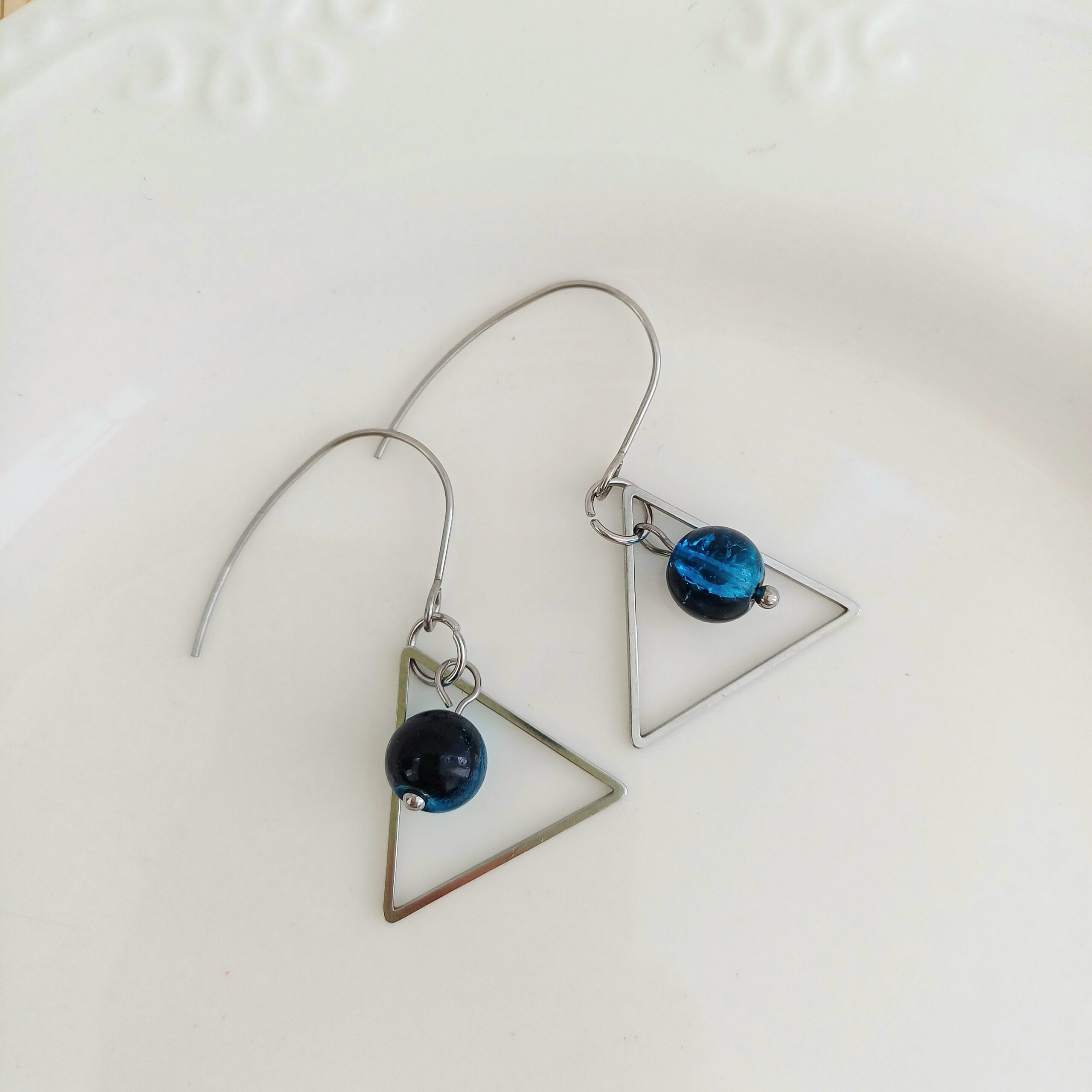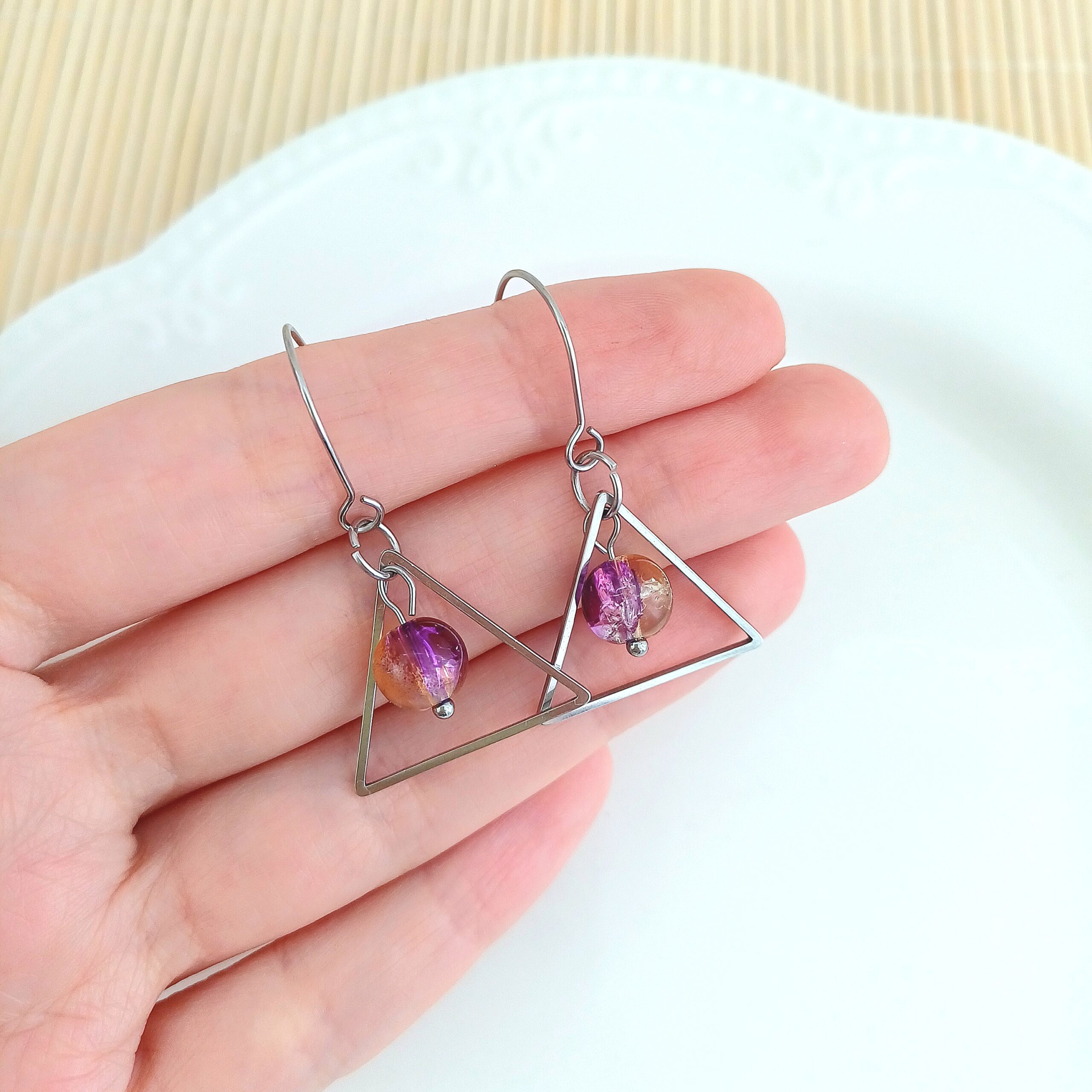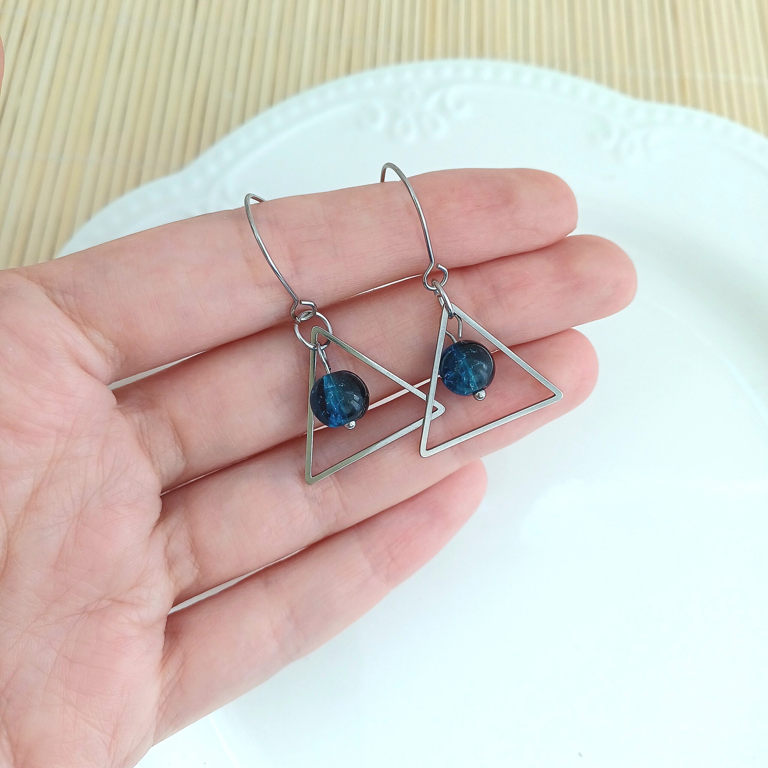 Acești cercei triunghi din oțel inoxidabil îmbină eleganța modernă cu un design geometric rafinat. Fiecare pereche are un cadru triunghiular delicat, din oțel inoxidabil lucios, completat de o mărgea de sticlă de 8 mm care atârnă subtil, creând un joc frumos de lumini și reflexii.