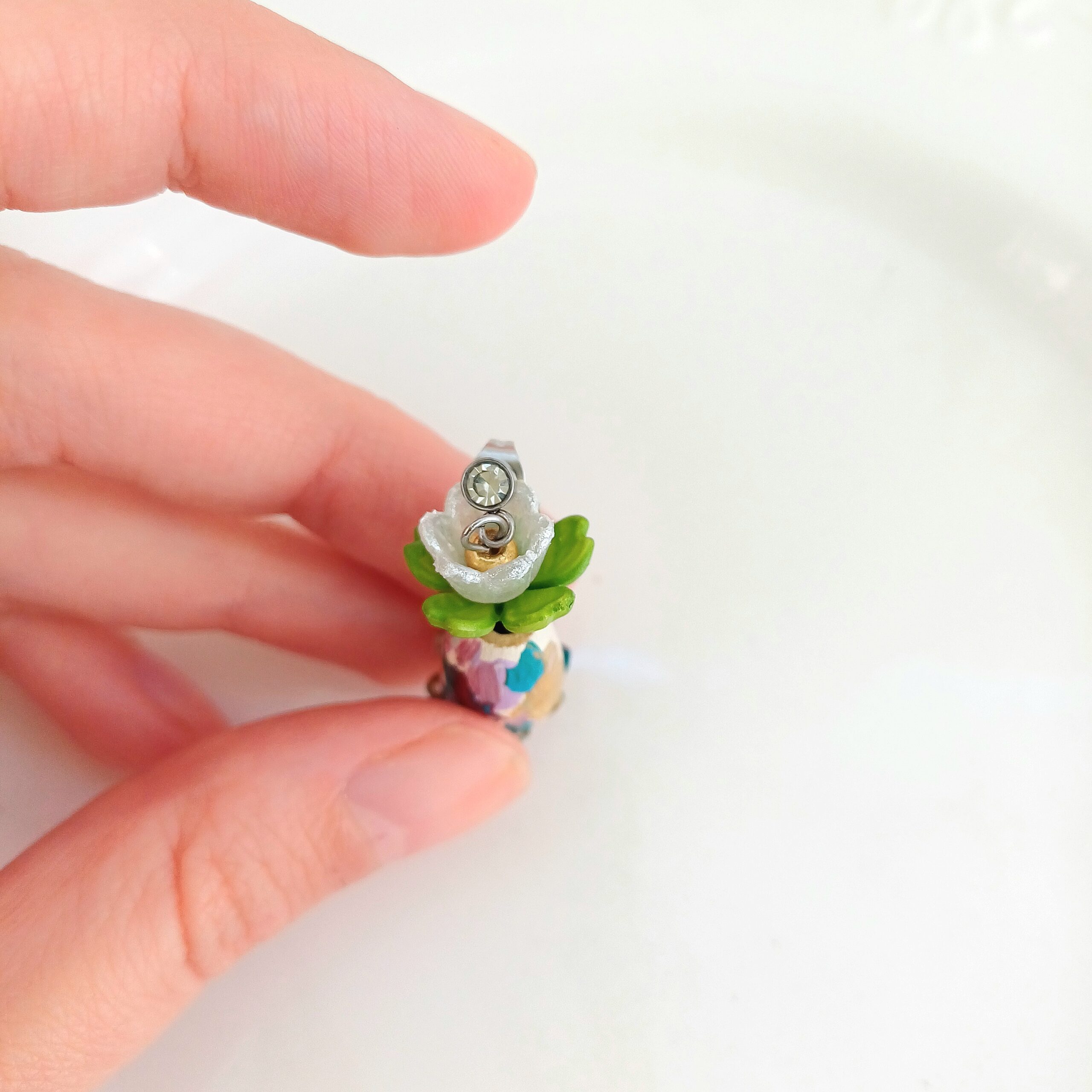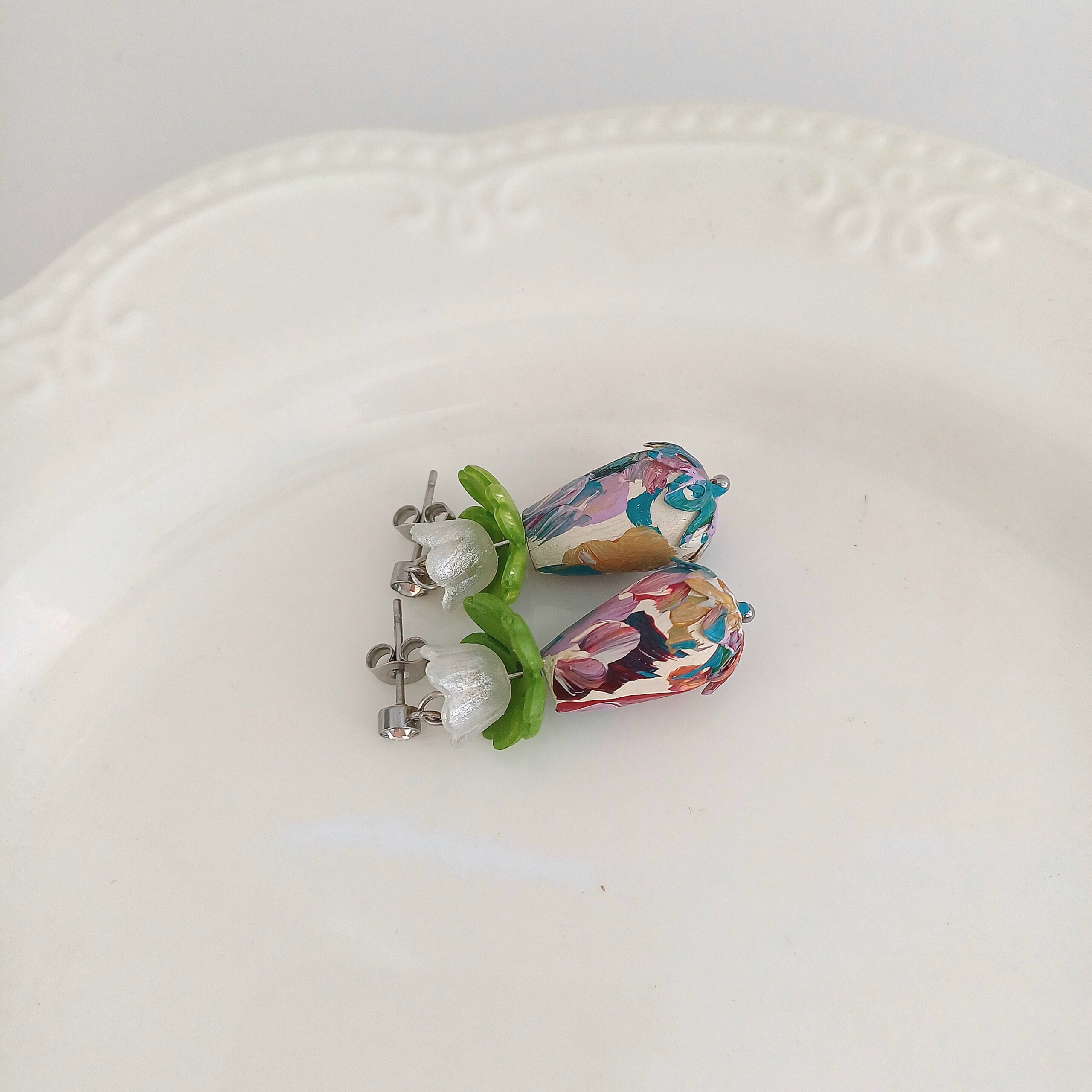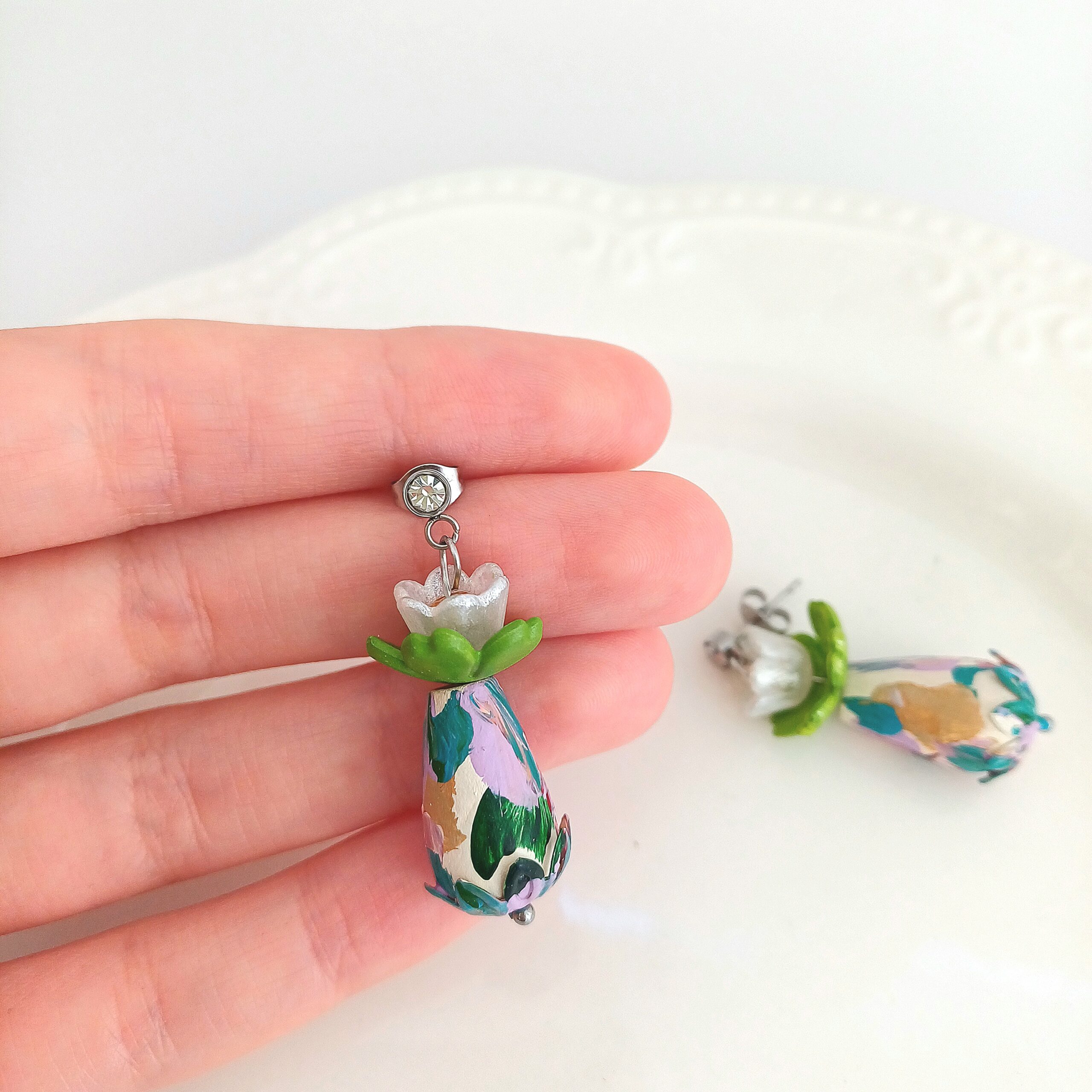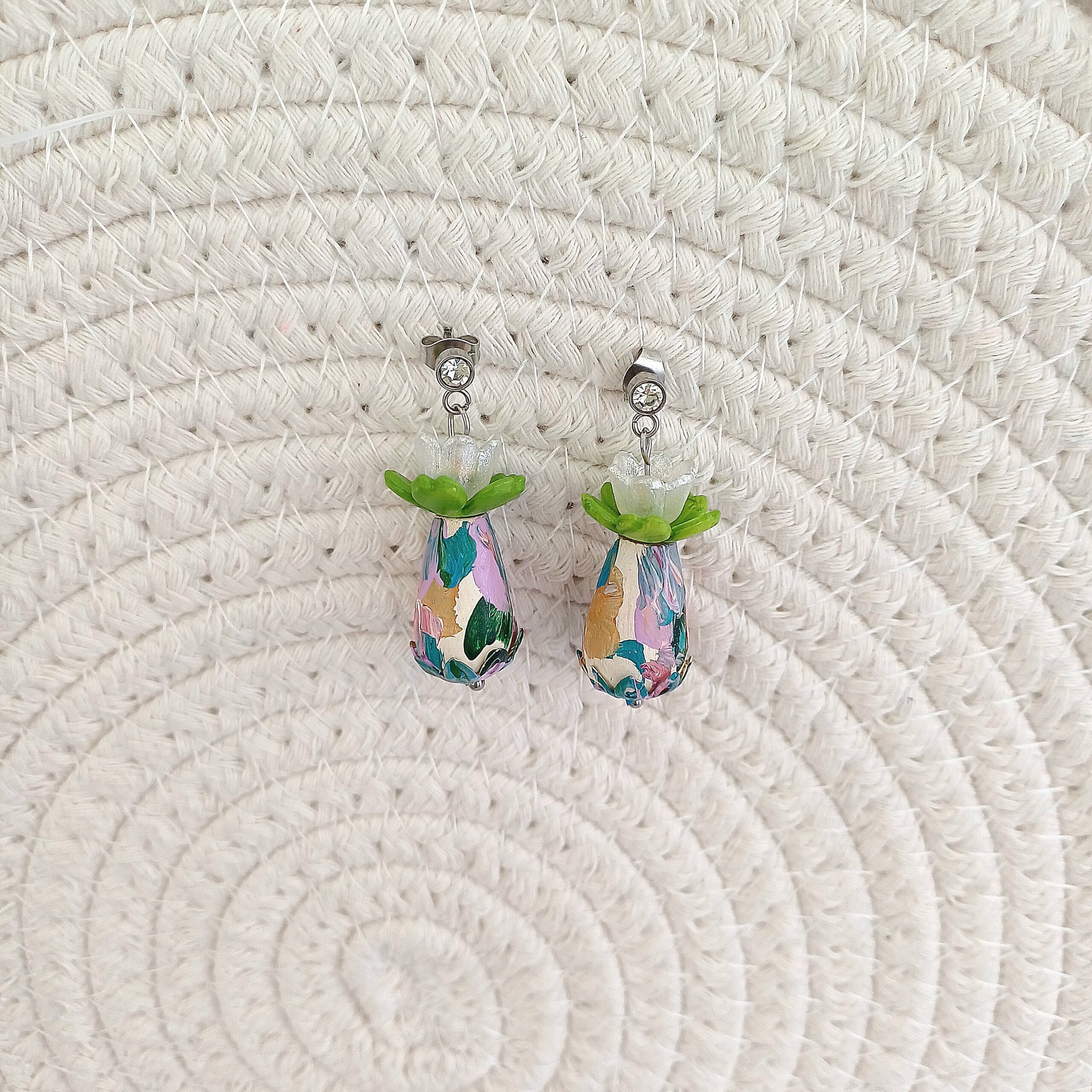 Fiecare pereche are o vază în formă de lacrimă, cu mărgea pictată manual cu vopsele acrilice și protejată cu lac rezistent la apă. Cerceii includ frunze verde deschis și flori albe delicate, pictate cu vopsea alba metalizată.