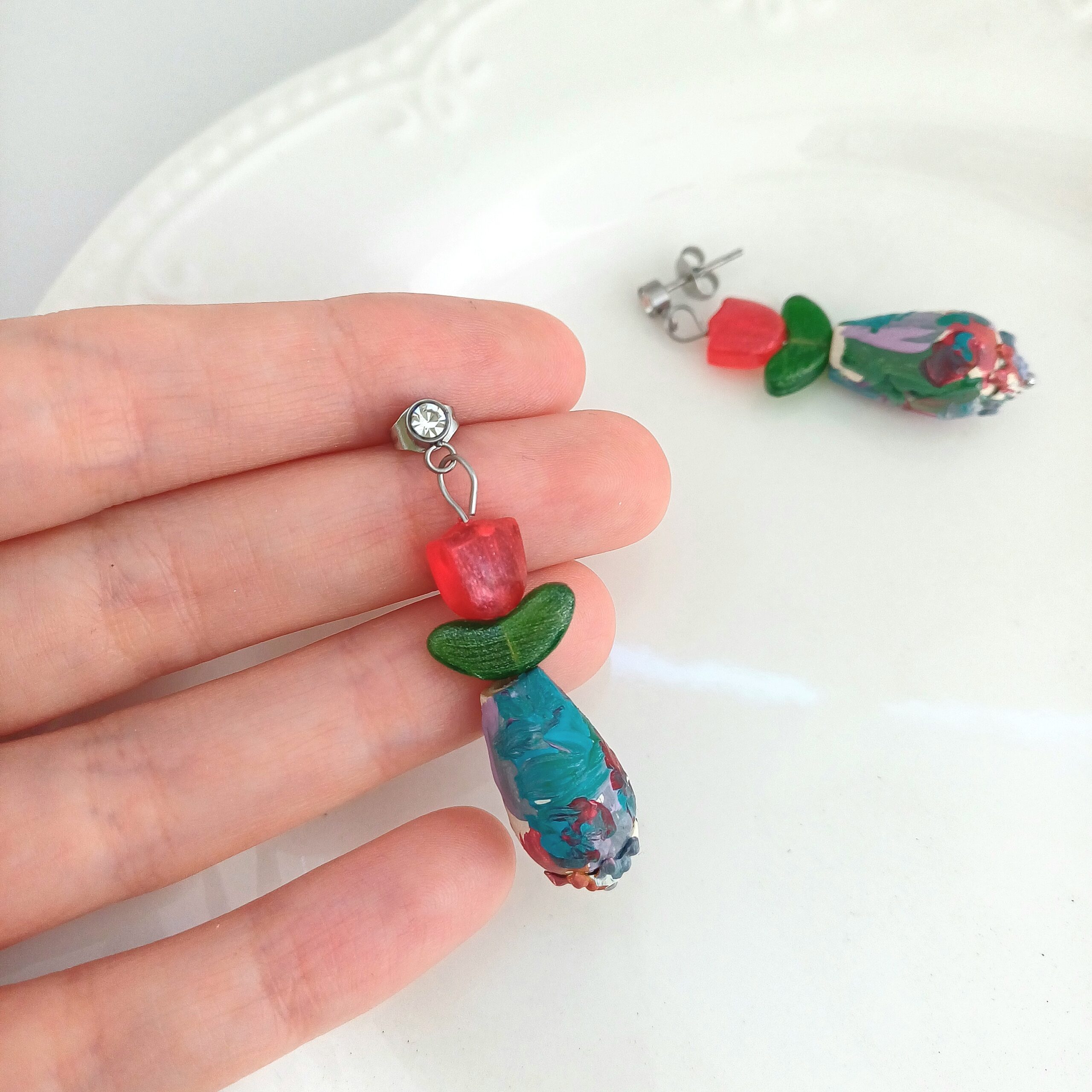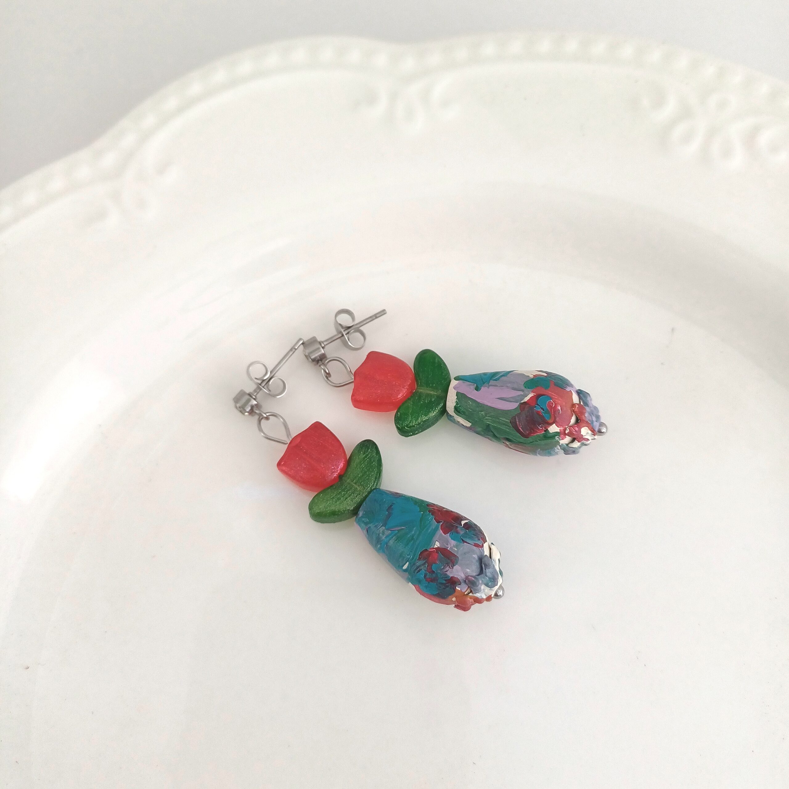 Fiecare pereche are o vază realizată dintr-o mărgea din lemn in forma de lacrimă pictată manual, decorată cu lalele roșii și frunze verzi, din sticla, pictate manual. Mărgelele sunt protejate cu lac rezistent la apă pentru a păstra frumusețea culorilor și strălucirea metalului.